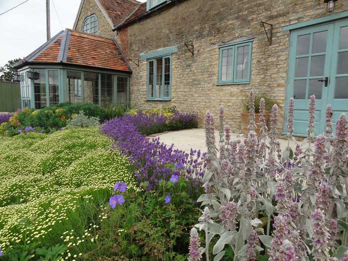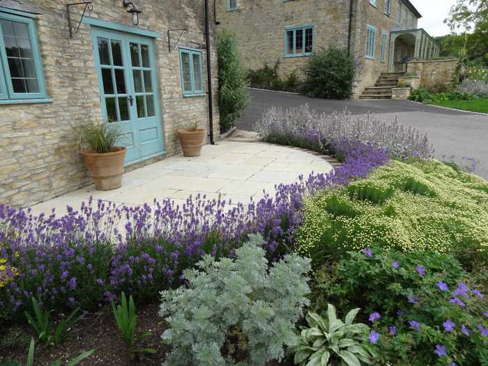 There was a large expanse of tarmac in front of the cottage which needed to be visually softened. I created a semi-circular terrace with blue, silver, grey and white planting.