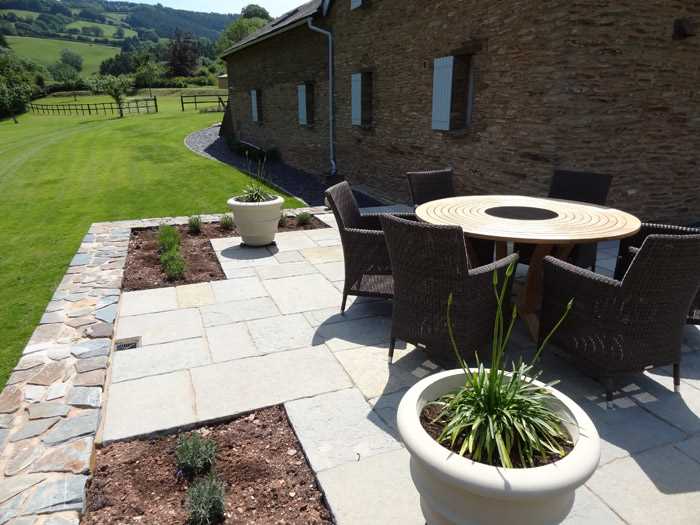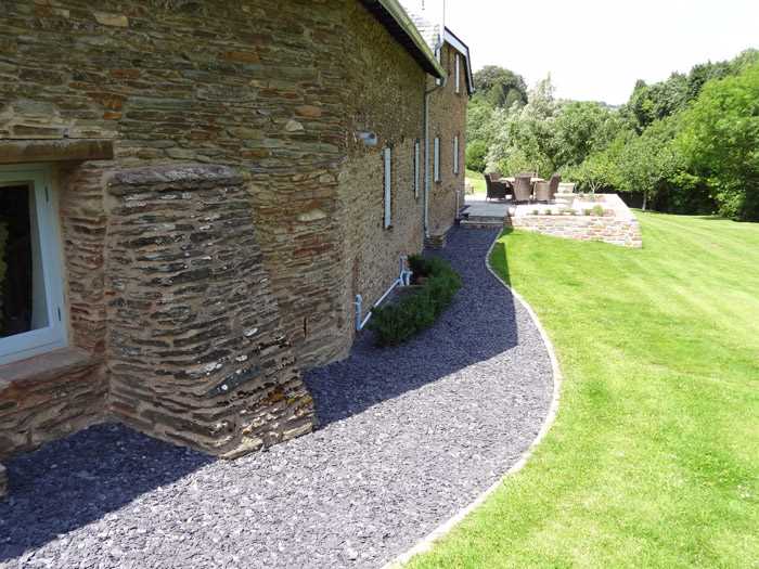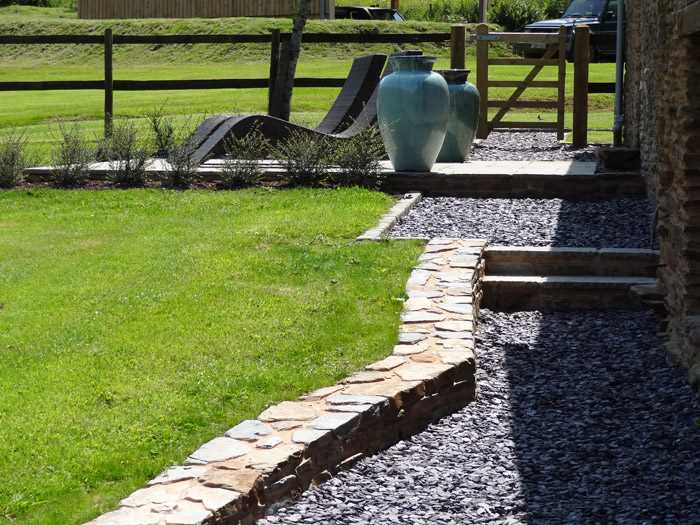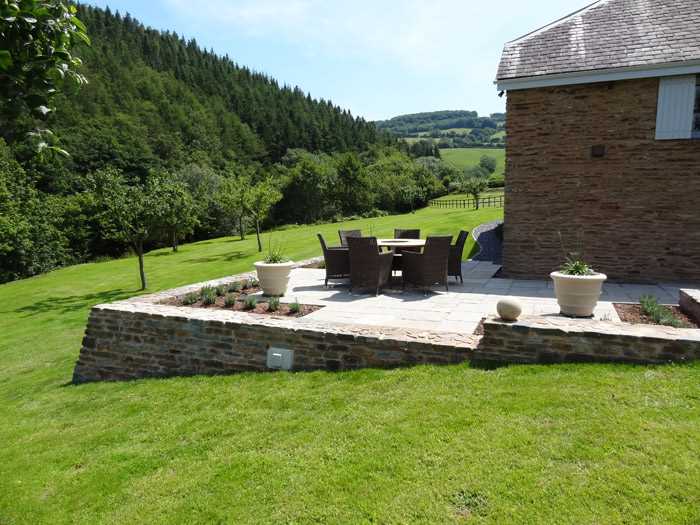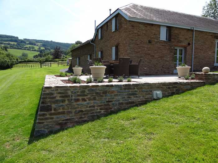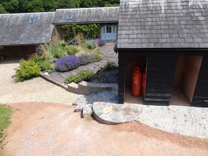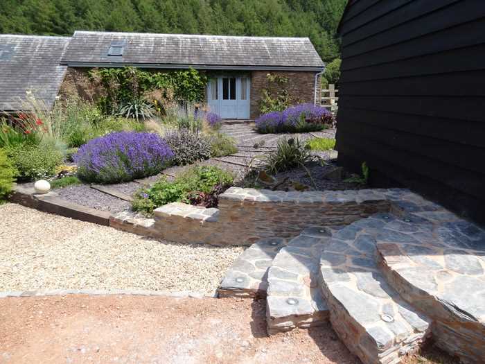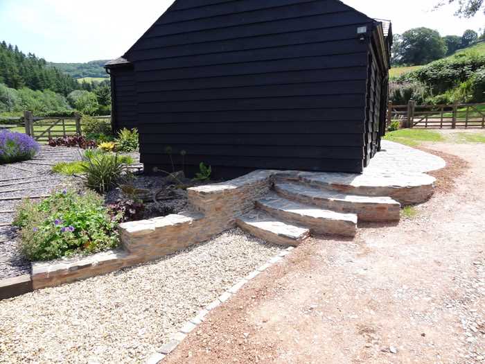 This beautifully converted barn is situated in its own valley in Somerset. The brief was to create an in-keeping terrace which would enjoy views up and down the valley. The main terrace is connected to a smaller terrace by a stone edged pathway, and both terraces are created using native stone walling. The design for the front garden and driveway includes steps which lead you to the front entrance of the house.